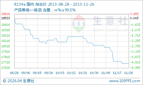 11月26日江苏地区R134a市场行情趋稳,市场主流报价17500-17800元/吨,实际成交价格在17000元/吨左右,下游需求清淡,交投一般;11月26日浙江中龙制冷剂有限公司氟制冷剂R134a出厂报价17750元/吨左右,库存尚可,销售情况尚可,厂家走货平稳;11月26日山东地区R134a市场行情持稳,市场主流报价17600-18000元/吨左右,实际成交价格还低,下游需求一般,交投清淡。