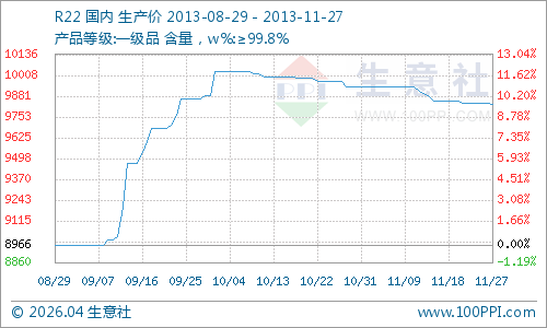11月27日山东地区制冷剂R22市场行情平稳,生产厂家主流出厂报价在9800元/吨左右,下游PTFE及空调行业需求一般,贸易商交投尚可,厂家走货平稳;11月27日江苏地区制冷剂R22市场行情盘整,生产厂家主流出厂报价在9700元/吨左右,下游PTFE及空调行业需求一般,贸易商交投尚可,厂家走货一般;11月27日浙江地区制冷剂R22市场行情盘整,生产厂家主流出厂报价在9700-9800元/吨左右,下游PTFE及空调行业需求清淡,贸易商交投尚可,厂家走货平稳。