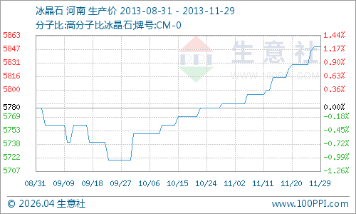 据生意社大宗榜数据显示,11月冰晶石市场价格上涨,截至月末国内出厂价格在5848元/吨,较月初价格5785元/吨上涨1.10%,市场主流报价为5800-6000元/吨。