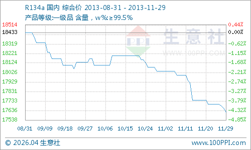 据生意社大宗榜数据显示,本月国内R134a行情大幅下跌,月初国内企业出厂报价均价18040元/吨,月末国内企业出厂报价均价17620元/吨,整体下跌2.33%。