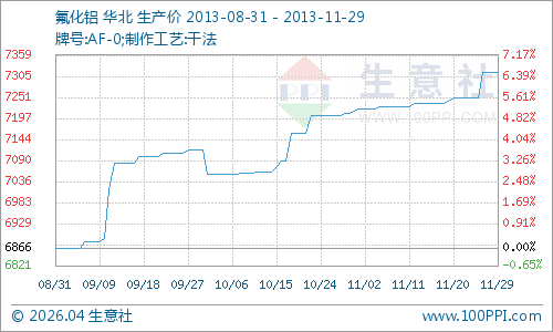 据生意社大宗榜数据显示11月干法氟化铝市场价格上涨,截至月末国内出厂价格在7312元/吨,较月初价格7221元/吨上涨1.26%,市场主流报价为7200-7500元/吨左右。