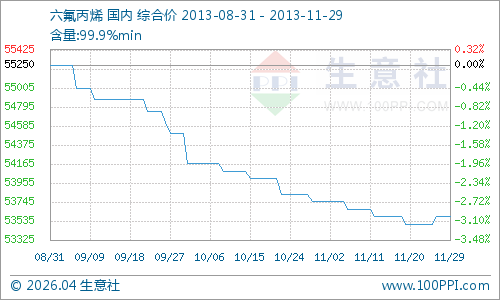 产品,11月六氟丙烯开工正常,维持在八成左右,货源充足,库存稳定,生产企业固定给1-2家客户供货,市场变化不大;