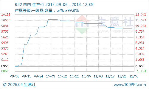 12月5日山东地区制冷剂R22市场行情平稳,生产厂家主流出厂报价在9800元/吨左右,下游PTFE及空调行业需求一般,贸易商交投尚可,厂家走货平稳;12月5日江苏地区制冷剂R22市场行情盘整,生产厂家主流出厂报价在9700元/吨左右,下游PTFE及空调行业需求一般,贸易商交投尚可,厂家走货一般;12月5日浙江地区制冷剂R22市场行情盘整,生产厂家主流出厂报价在9700-9800元/吨左右,下游PTFE及空调行业需求清淡,贸易商交投尚可,厂家走货平稳。