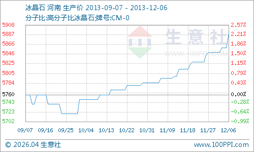 据生意社大宗榜数据显示,本周国内冰晶石行情上涨。周初国内企业出厂报价均价在5850元/吨左右,到本周末国内企业对外报价波动至5890元/吨左右,上涨幅度为0.70%。