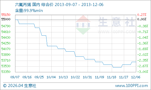 据生意社大宗榜数据显示,本周国内六氟丙烯行情稳定。周初国内企业出厂报价均价在53583元/吨左右,到本周末国内企业对外报价波动至53666元/吨左右,上涨幅度为0.16%。