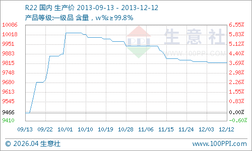 12月12日浙江地区制冷剂R22市场行情盘整,生产厂家主流出厂报价在9700-9800元/吨左右,下游PTFE及空调行业需求清淡,贸易商交投尚可,厂家走货平稳;12月12日江苏地区制冷剂R22市场行情盘整,生产厂家主流出厂报价在9700元/吨左右,下游PTFE及空调行业需求一般,贸易商交投尚可,厂家走货一般;12月12日山东地区制冷剂R22市场行情平稳,生产厂家主流出厂报价在9800元/吨左右,下游PTFE及空调行业需求一般,贸易商交投尚可,厂家走货平稳。