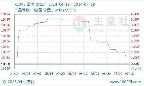 据生意社大宗榜数据显示,本周国内R134a行情小幅下滑,周初国内企业出厂报价均价18560元/吨左右,周末国内企业出厂报价均价18480元/吨左右,总体下滑0.43%,与去年同期同比下跌11.30%。