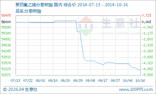 据生意社大宗榜数据显示,本周聚四氟乙烯价格略有下跌。周初聚四氟乙烯平均价格在53277.78元/吨,周末聚四氟乙烯平均价格在53166.67元/吨,价格小幅下跌0.21%,较去年同比下降了15.61%。周四聚四氟乙烯分散树脂商品指数为37.93,与周三持平,创下周期内的历史新低,较2011年12月12日最高点103.09点下降了63.21%。(注:周期指2011-09-01至今)