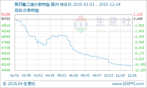 据生意社大宗榜数据显示,2015年度聚四氟乙烯1-3月份市场价格下跌,4-6月经历一个高位时期,然后6月之后的价格一直趋于下跌。年初国内市场价格为50722元/吨左右,年末(截止12月24日)国内市场价格为45055元/吨,价格下跌幅度达11.17%。