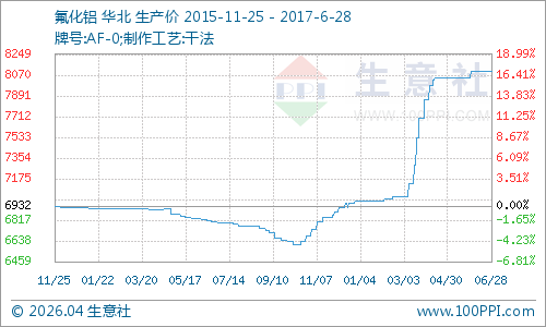 据生意社大宗榜数据显示,6月27日国内干法氟化铝市场价格暂稳,市场均价为8050元/吨,同比上调17.25%。